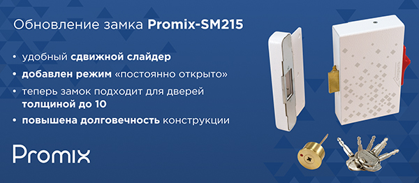 Компания Promix представила обновлённую версию электромеханического замка Promix-SM215. Модернизация стала результатом длительной работы над конструкцией изделия и анализа пользовательского опыта, что позволило повысить удобство эксплуатации и надёжность замка.